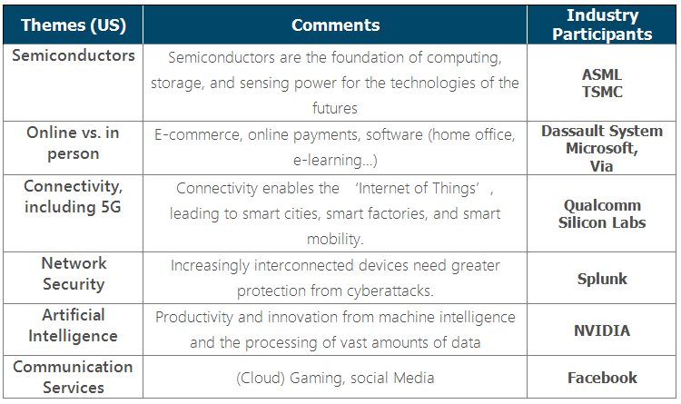 The SARS outbreak in 2003 was a major boost to the adoption of online shopping and the rise of Alibaba in China. Coronavirus has the potential for more dramatic change in our use of technology. Our new and now almost ubiquitous experiences of tele-commuting for office workers should clearly accelerate the adoption of uses such as homeworking, e-learning, or tele-medicine. Virtual reality – including video -- should permanently gain, relative to pre-Covid usage, at the expense of some amount of physical travelling and gathering. These developments all mean increasing markets for broadband connections, semiconductors, connectivity, software, and social media… and on the other hand, the growth of cybercrime.