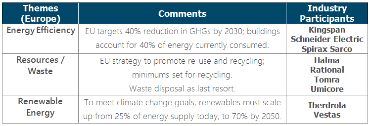 With Europe a bit ahead of the curve in pushing environmental regulation, we highlight three themes -- energy efficiency, resources and waste, and renewable energy – each of which benefits from current or proposed government goals, particularly in EU countries. They also have multiple drivers for upside fundamentals. Companies which help corporate and individual consumers use less energy are helping those customers save money, while energy efficiency also helps reduce the reliance of the EU on external oil and gas. Those resource efficiency technologies which are currently profitable have often begun, as many new technologies, with some subsidy, and then taken off once the industry reached a critical scale. Renewables are already benefitting from the faith of ‘early adopters’, and the economics continue to improve.
